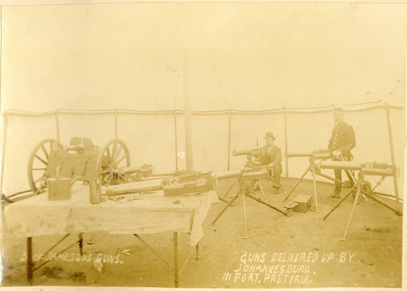 - Photograph titled "5 of Jameson's guns" showing two men with five of Dr Jameson's machine guns in a tent. Also written on the photograph is "Guns delivered up by Johannesburg. In Fort, Pretoria".