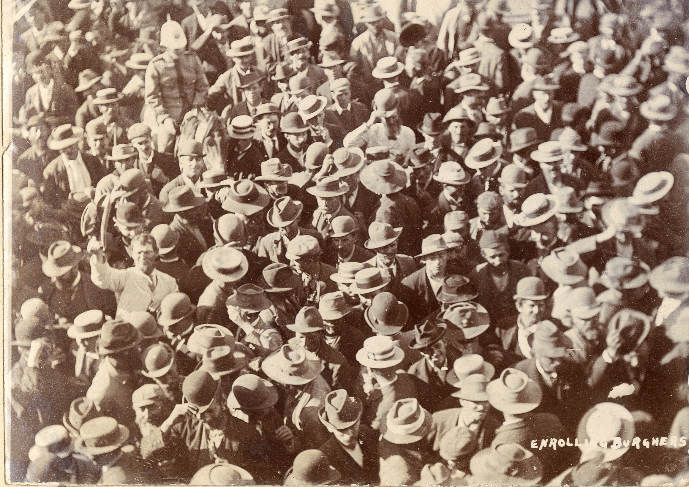 - Photograph titled "Enrolling Burghers" showing a large group of men.