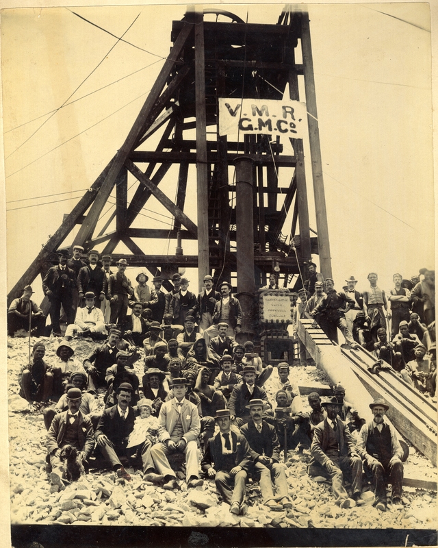 - Photograph titled "V.M.R. Gold Mine Co." showing a group of men sitting around a mine shaft of the Village Main Reef Gold Mining Company. There is a plaque on the front of the mine shaft inscribed with the words "Harvey and Co. Ld Hayle Cornwall England".