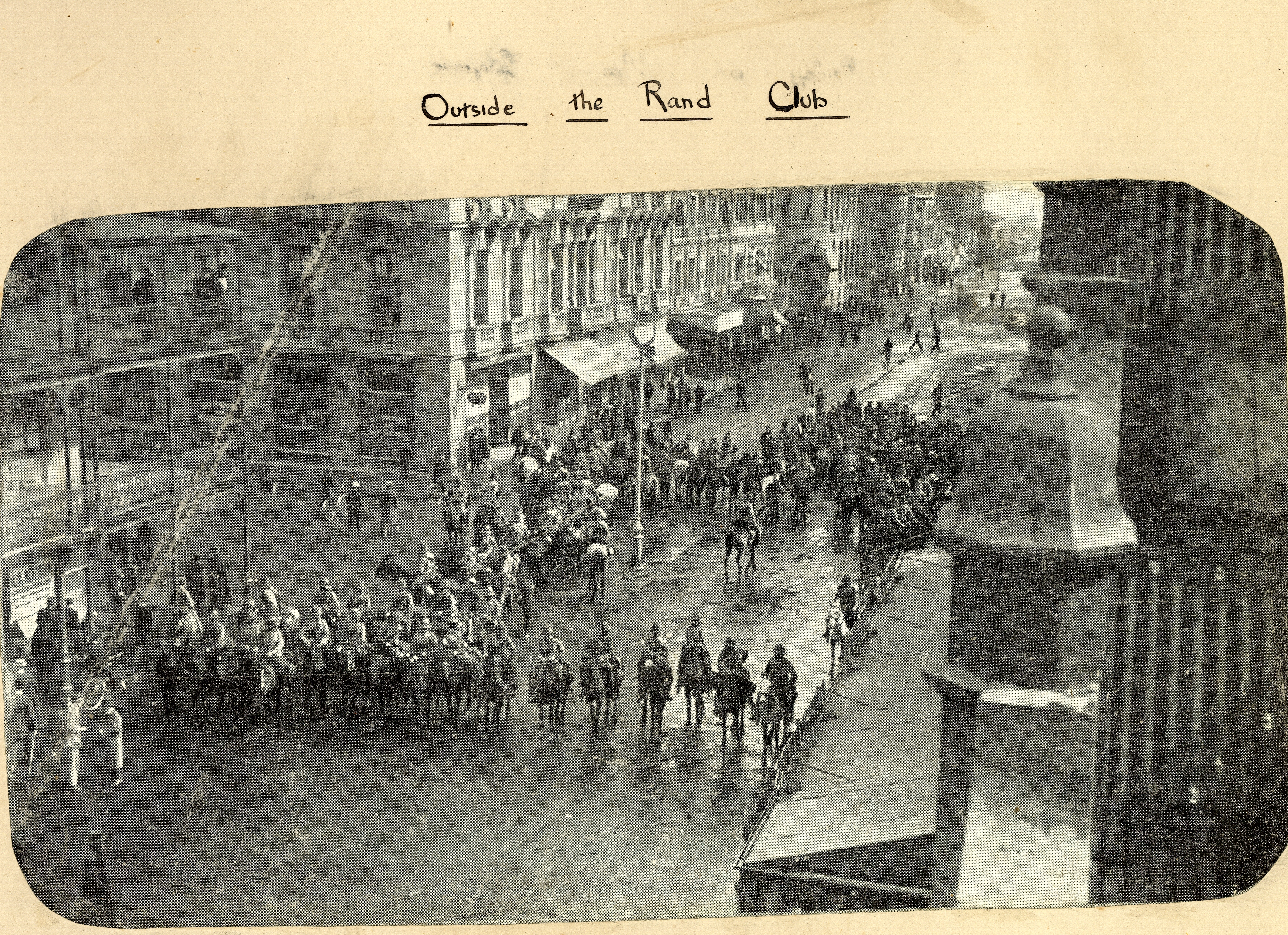 - Photograph titled: "Outside the Rand Club", showing a group of armed men on horseback facing a crowd of people outside the Rand Club in Johannesburg. The club was one of the targets of the striking miners during the Rand Rebellion of 1922 and was briefly barricaded during the disturbances.