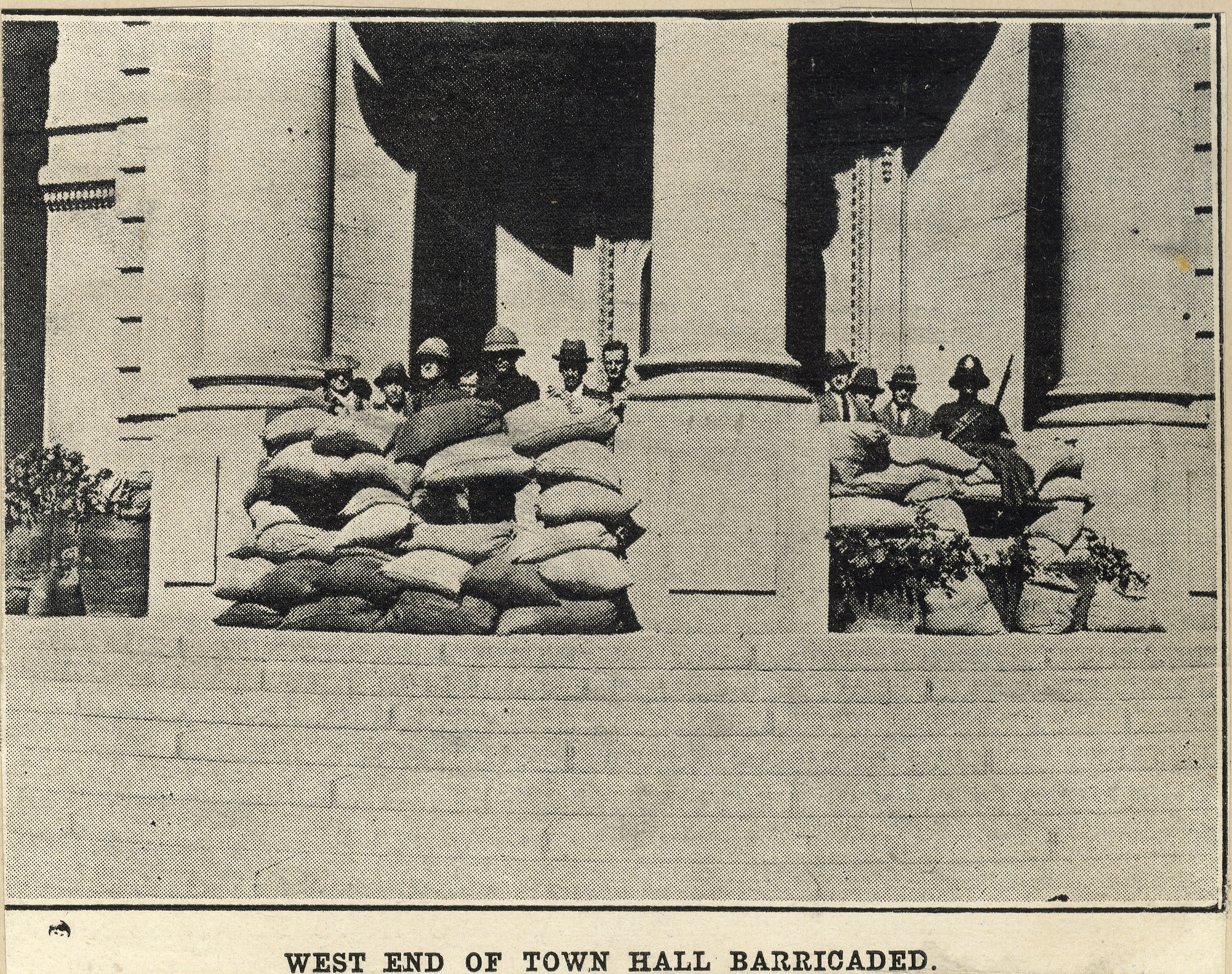- Newspaper clipping titled: "West End of Town Hall Barricaded" showing a group of men behind a sandbag fortification.