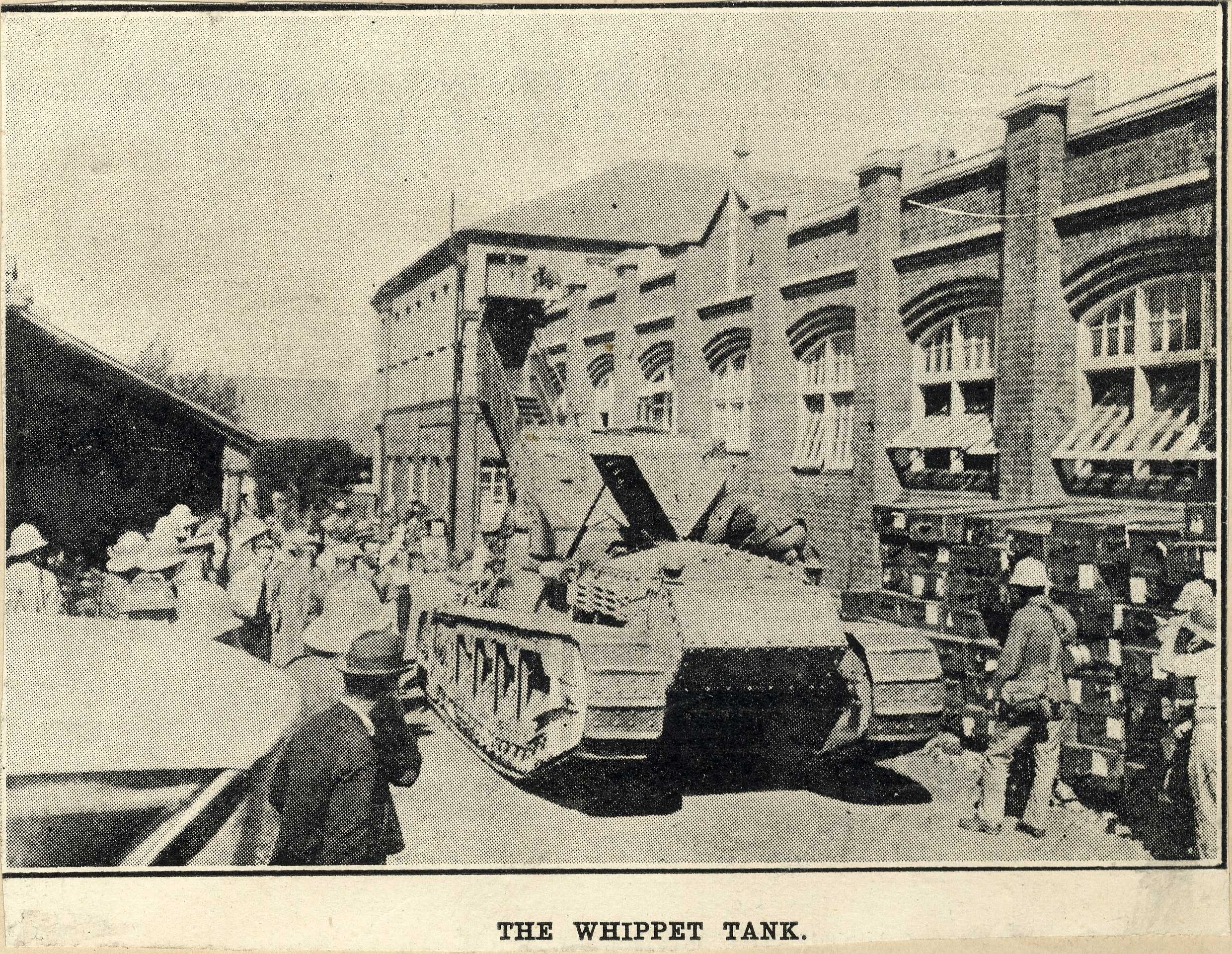 - Newspaper clipping titled: "The Whippet tank", showing a military tank also known as "The Medium Mark A Whippet" which was a British tank intended for fast mobile assaults.