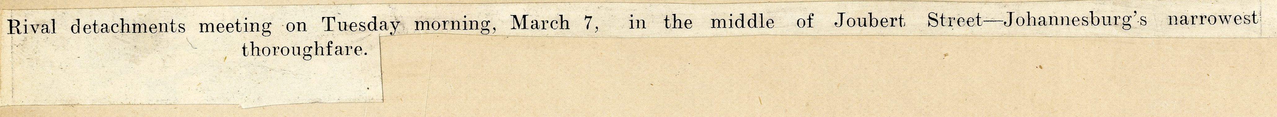 - Newspaper clipping of a photograph heading: "Rival detachments meeting on Tuesday morning, March 7, in the middle of Joubert Street - Johannesburg's narrowest thoroughfare".