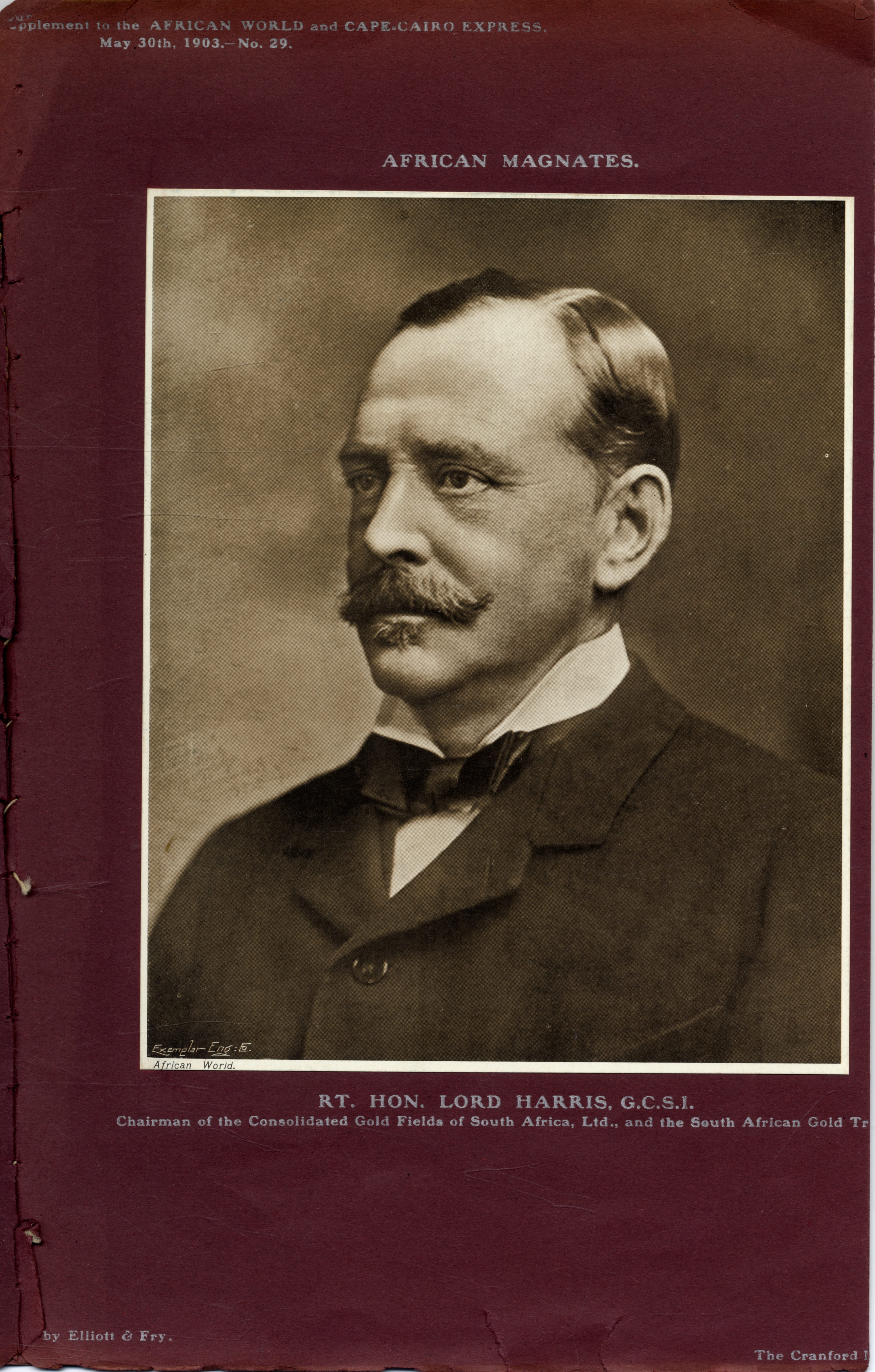 - Portrait of Rt. Hon. Lord Harris, G.C.S.I. Chairman of the Consolidated Gold Fields of South Africa, Ltd., and the South African Gold Trust. Portrait published in "African World" as a supplement to "African World and Cape Cairo Express", No. 29, published in London, May 30th, 1903.
