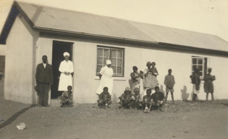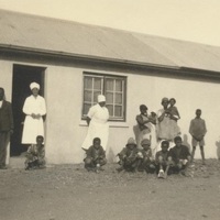 - A photograph album compiled by Mary Butler, containing photographs of Wayfarers, Sunbeams and Pathfinders, mostly in Cradock. Two newspaper clippings and a handwritten concert programme included. There are three photographs of Rev. James Arthur Calata's young daughters, and he himself is included in two photographs. This photograph showing a group of people and two nurses standing infront of a dispensary or health clinic. They have probably come to collect medicine, or to get medical treatment