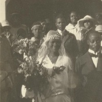 - A photograph album compiled by Mary Butler, containing photographs of Wayfarers, Sunbeams and Pathfinders, mostly in Cradock. Two newspaper clippings and a handwritten concert programme included. There are three photographs of Rev. James Arthur Calata's young daughters, and he himself is included in two photographs. This photograph showing an African wedding ceremony infront of a church, bride and groom with the entourage