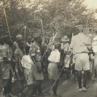 - A photograph album compiled by Mary Butler, containing photographs of Wayfarers, Sunbeams and Pathfinders, mostly in Cradock. Two newspaper clippings and a handwritten concert programme included. There are three photographs of Rev. James Arthur Calata's young daughters, and he himself is included in two photographs. This photograph showing a group of young and older boys, Pathfinders, wearing uniform and performing a folk dance