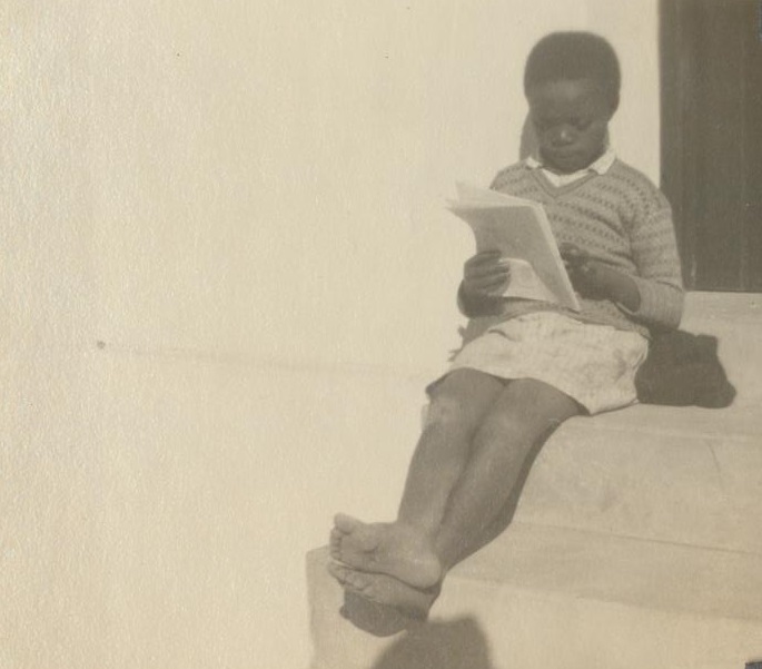 - A photograph album compiled by Mary Butler, containing photographs of Wayfarers, Sunbeams and Pathfinders, mostly in Cradock. Two newspaper clippings and a handwritten concert programme included. There are three photographs of Rev. James Arthur Calata's young daughters, and he himself is included in two photographs. This photograph showing one of James Arthur Calata's daughters sitting on the stoep reading a book