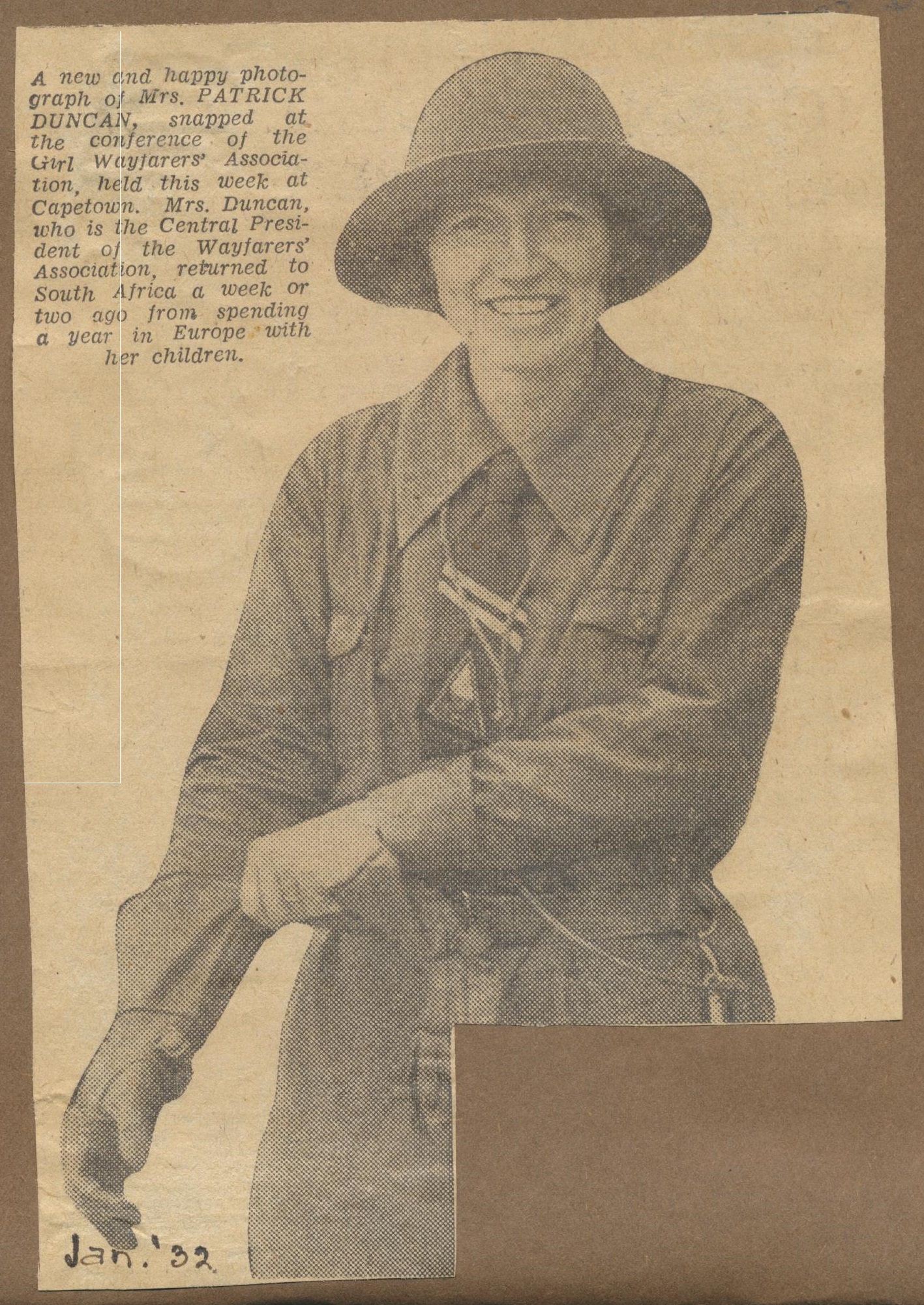 - A photograph album compiled by Mary Butler, containing photographs of Wayfarers, Sunbeams and Pathfinders, mostly in Cradock. Two newspaper clippings and a handwritten concert programme included. There are three photographs of Rev. James Arthur Calata's young daughters, and he himself is included in two photographs. This photograph showing Mrs Patrick Duncan. Typescript: "Photograph of Mrs Patrick Duncan, snapped at the conference of the Girl Wayfarers's Association, held this week at Cape Town. Mrs Duncan, who is the Central President of the Wayfarers' Association, returned to South Africa a week or two ago from spending a year in Europe with her children