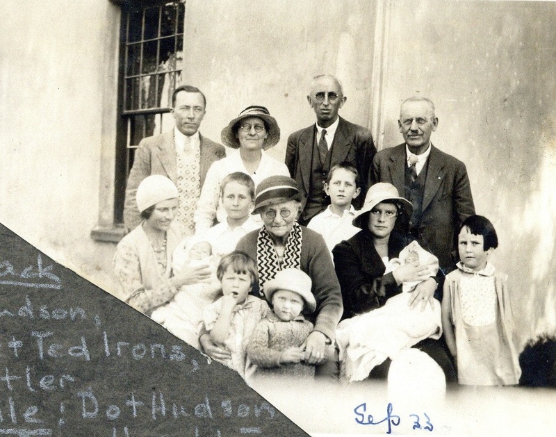 - Back Reg Hudson, Grace and Ted Irons, Charles Butler, middle Dot Hudson with Alan, Harold Irons, Emma Butler, David Irons, Blodwen Butler with Roy, Pamela Iron, front Jean Irons and Norman Hudson.