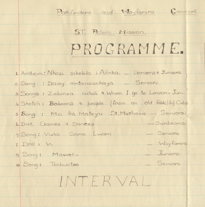 “Programme - Pathfinders and Wayfarer's concert at St Peters' Mission”, Cory Library and Historical Archives, accessed 29 December 2025, https://digitalarchives.ru.ac.za/s/cory/item/9914