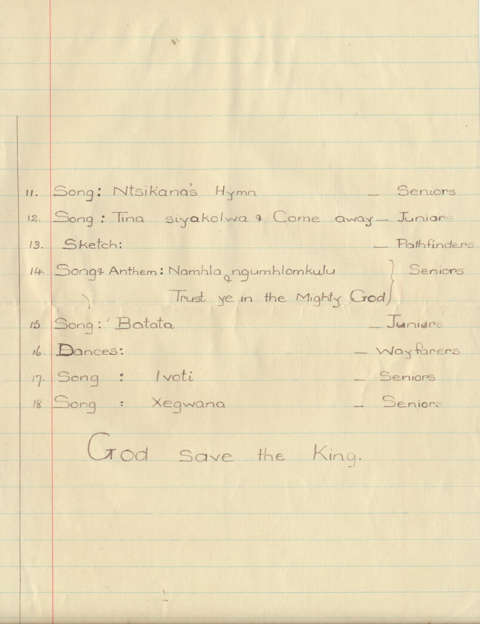 - A photograph album compiled by Mary Butler, containing photographs of Wayfarers, Sunbeams and Pathfinders, mostly in Cradock. Two newspaper clippings and a handwritten concert programme included. There are three photographs of Rev. James Arthur Calata's young daughters, and he himself is included in two photographs. This photograph showing a handwritten programme for Pathfinders and Wayfarer's concert at St Peters' Mission