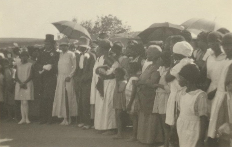 - A photograph album compiled by Mary Butler, containing photographs of Wayfarers, Sunbeams and Pathfinders, mostly in Cradock. Two newspaper clippings and a handwritten concert programme included. There are three photographs of Rev. James Arthur Calata's young daughters, and he himself is included in two photographs. This photograph showing spectators watching Wayfarers, Pathfinders and Sunbeams performing games and dance at the Bantu Sports Ground, 1931