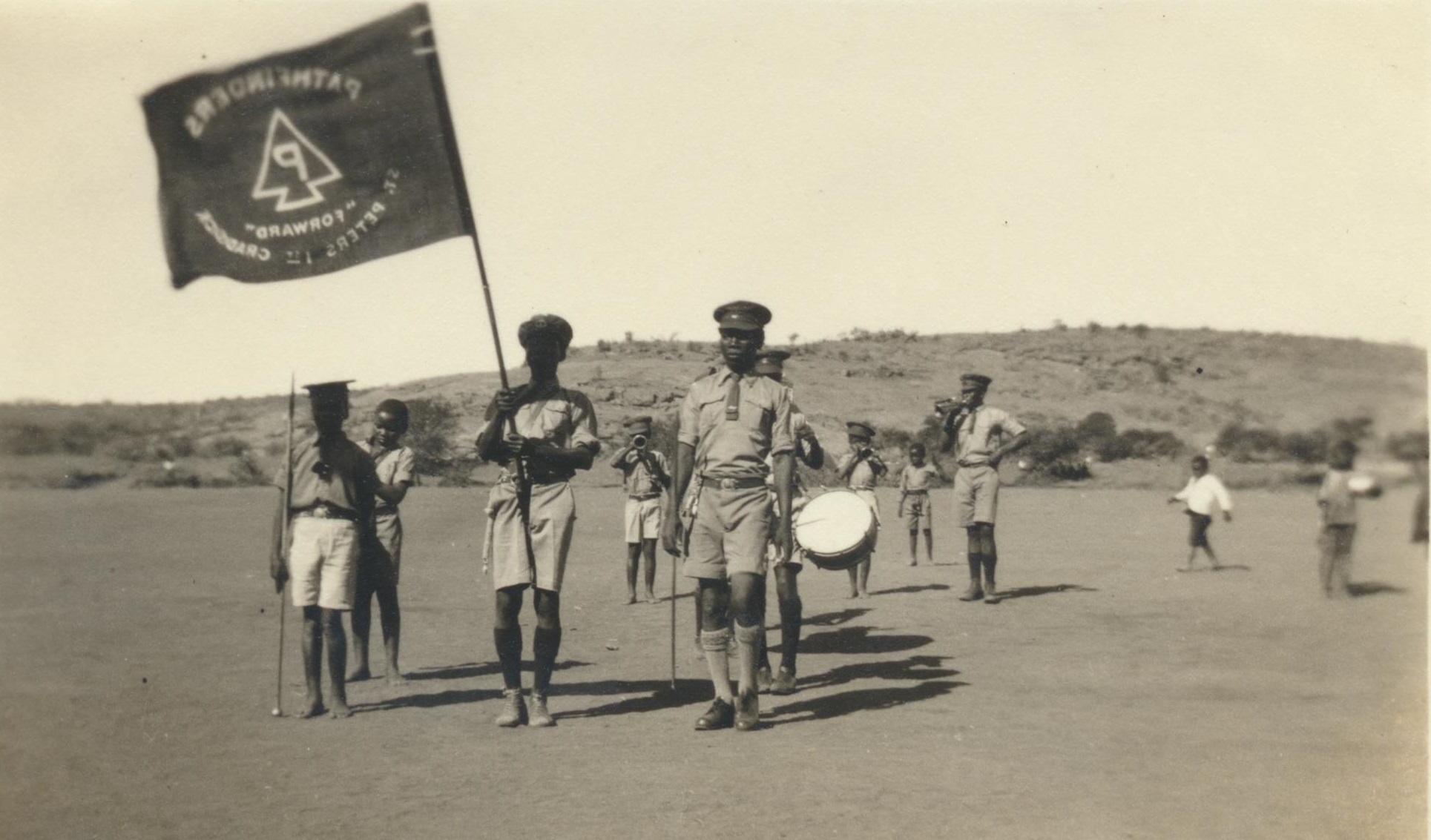 - A photograph album compiled by Mary Butler, containing photographs of Wayfarers, Sunbeams and Pathfinders, mostly in Cradock. Two newspaper clippings and a handwritten concert programme included. There are three photographs of Rev. James Arthur Calata's young daughters, and he himself is included in two photographs. This photograph showing Pathfinder's marching band bearing perform and bearing a flag during St Andrews Day, 1930