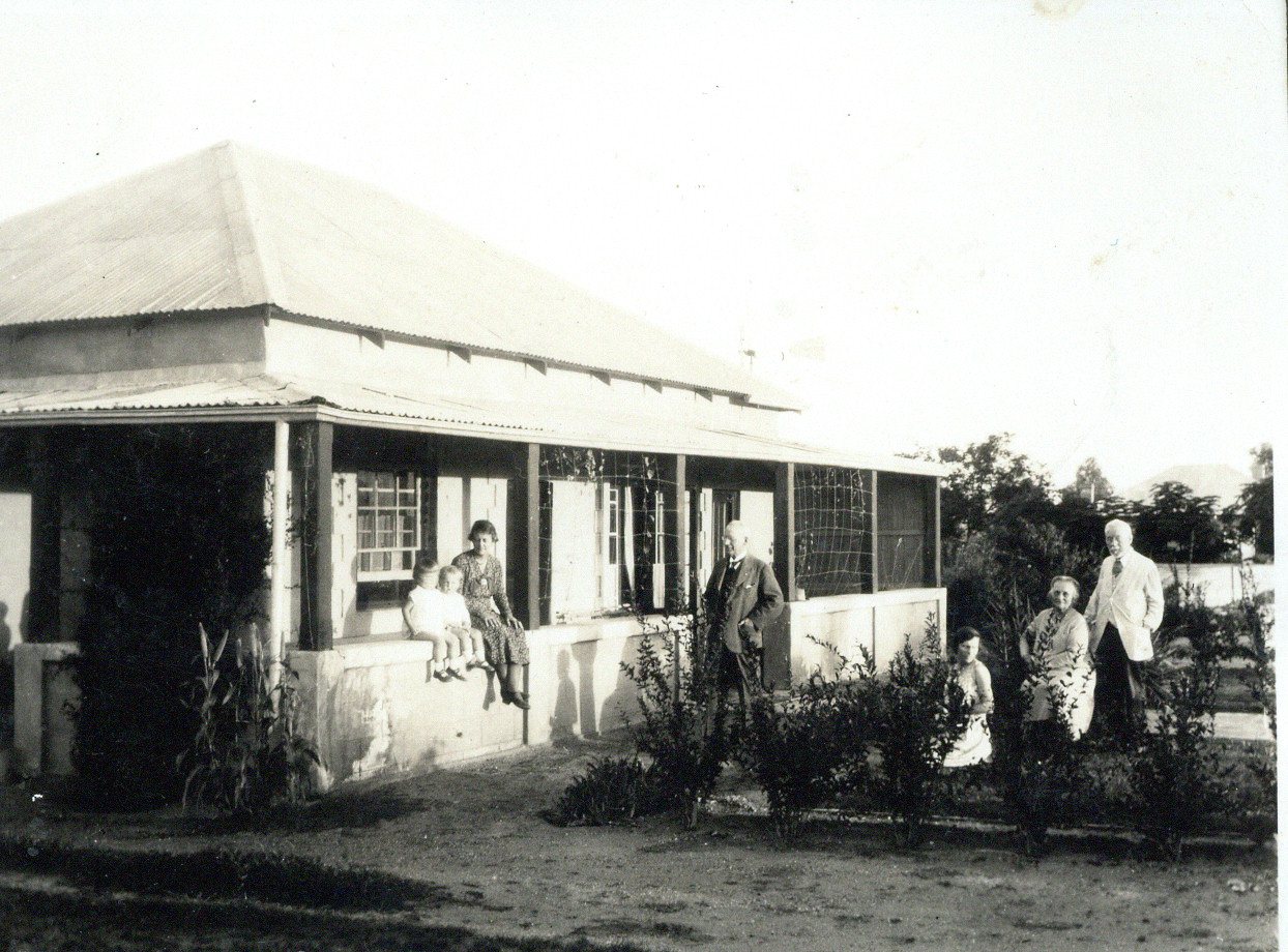 - Grace Irons sitting on the wall, Charles Butler, Dorothy, Emma and Joe Butler, Charles' brother visiting South Africa at the age of 80.