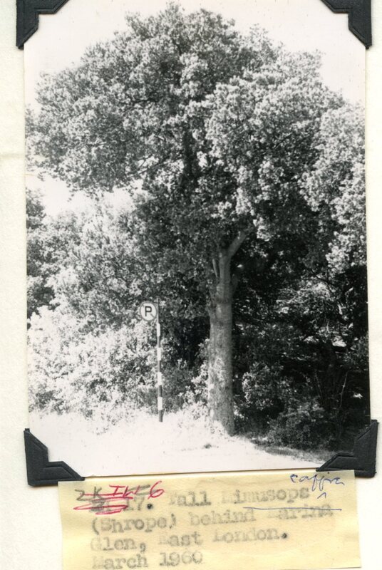 - Caption: "Tall Mimusops (Shrope) behind Marina Glen, East London. March 1960."