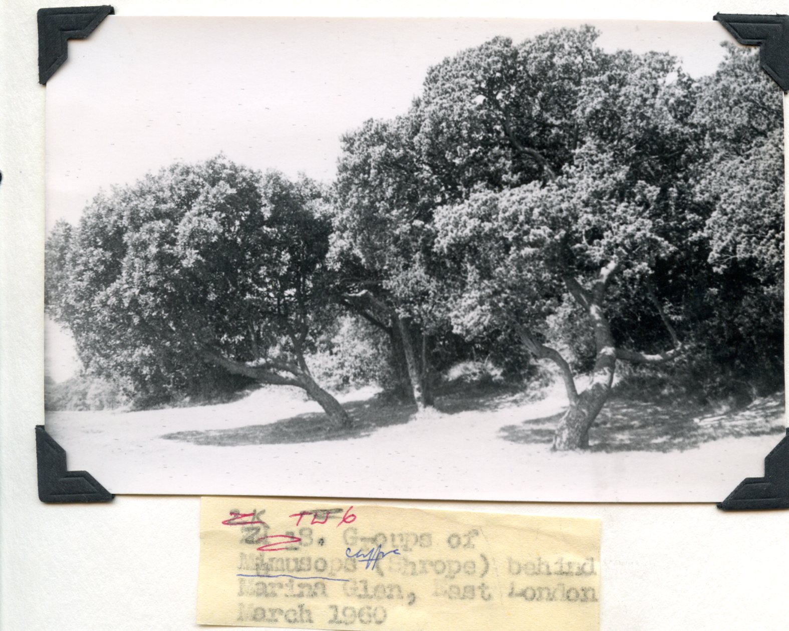 - Caption: "Group of Mimusops (Shrope) behind Marina Glen, East London. March 1960."