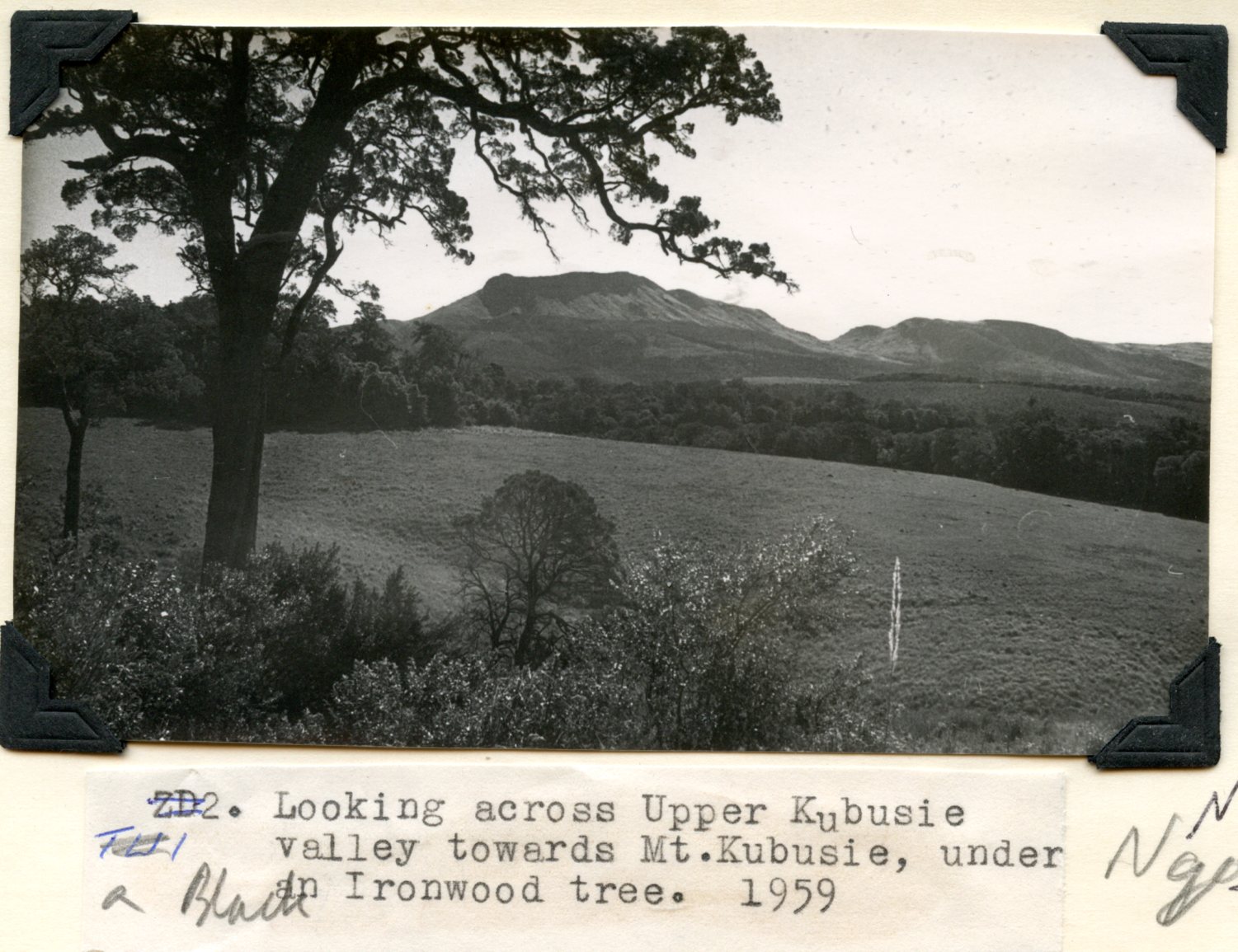 - Caption: "Looking across Upper Kubusie valley towards Mt. Kubusie, under Black Ironwood tree. 1959."