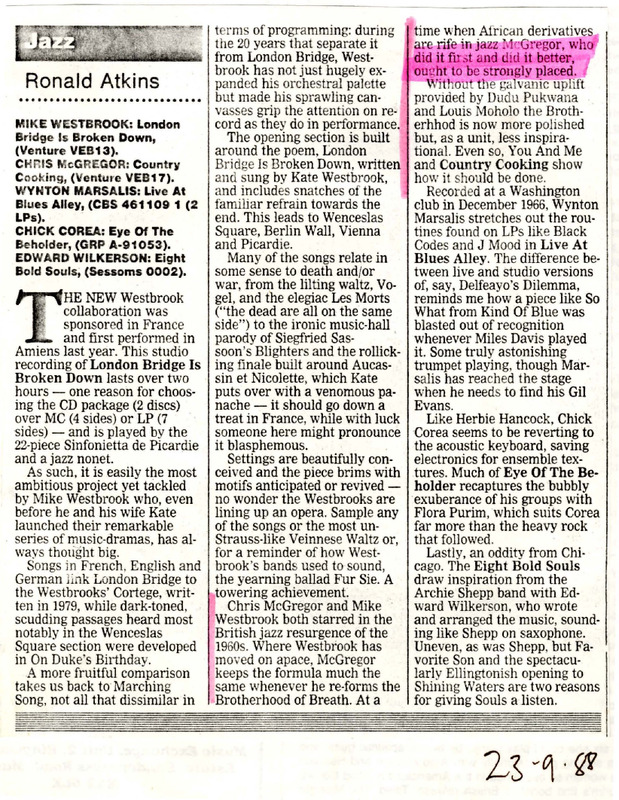 - Photocopied article by Ronald Atkins about new releases by Mike Westbrook, Chris McGregor, Wynton Marsalis, Chick Corea and Edward Wilkerson. The author describes shortly each recording.