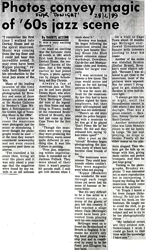 - Photocopied article form the newspaper Star Tonight about Basil Breakey and how he met other contemporary jazz musicians such as Chris McGregor and Abdullah Ibrahim.