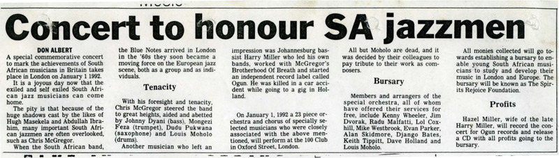 - Photocopied article which announces a concert tributed to Chris McGregor and all the members of Brotherhood of Breath, who died at the 100 Club, London.
