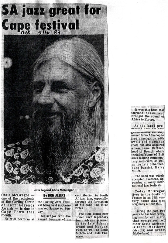 - Article from the newspaper The Star announcing a concert by Chris McGregor with the band Brotherhood of Breath at the Carling Jazz Festival, held in Greenmarket Square in Cape Town, after winning an award at the Jazz Legends Awards. There is also a picture of Chris McGregor with the article.