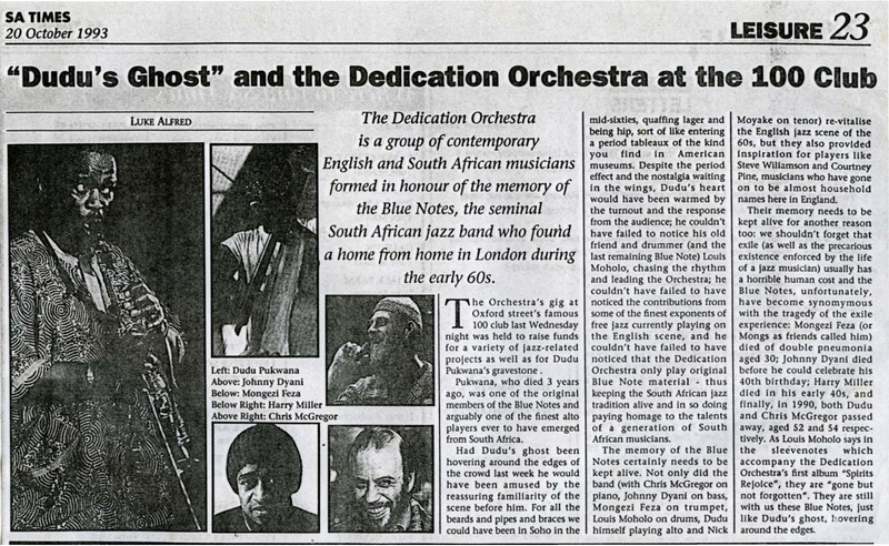 - The Dedication Orchestra is a group of contemporary English and South African musicians formed in honour of the memory of the Blue Notes, the seminal South African jazz band who found a home from home in London during the early 60s.,Photocopied article from the newspaper SA Times about a concert by the Dedication Orchestra at the 100 Club, London, in honour of the memory of the Blue Notes. There are 5 pictures with the article. The left picture shows Dudu Pukwana playing soprano saxophone, the top middle photo shows Johnny Dyani playing double bass, Mongezi Feza is on the below photo, Chris McGregor is on the top right picture and on the below right photo there is Harry Miller.