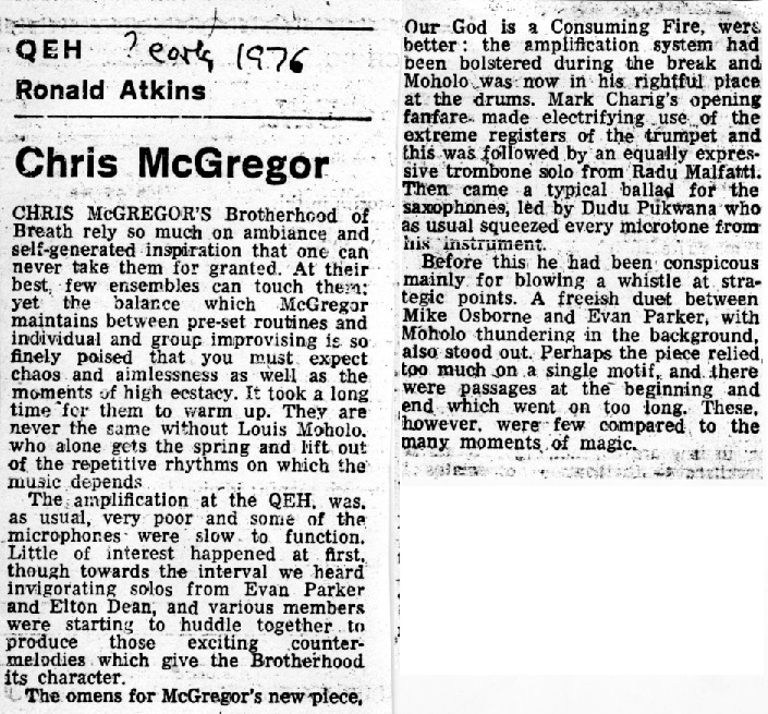 - Photocopied article about a concert at QEH (Queen Elizabeth Hall) in London, England, by Chris McGregor and the Brotherhood of Breath.
