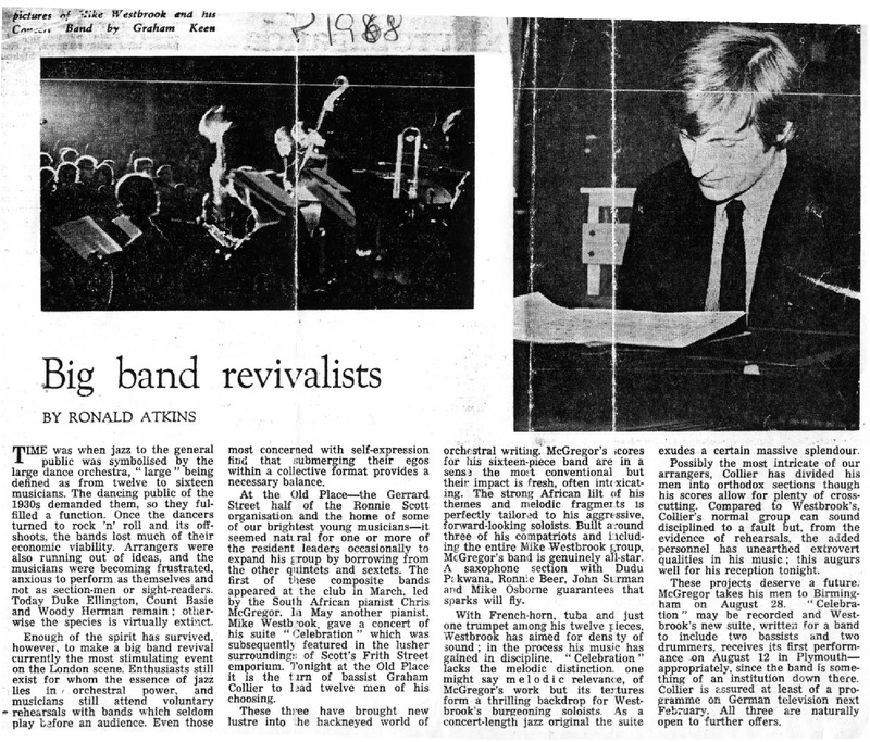 - Photocopied article about the revival of big bands after rock 'n' roll was born. There are 2 pictures with this article. The left picture shows Mike Westbrook's Concert Band on stage and the right picture is a portrait of Mike Westbrook playing piano.