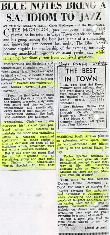 - Photocopied article from the South African newspaper Cape Argus about a concert at Weizmann Hall, Cape Town, by Chris McGregor's Blue Notes. The band has established itself "among the best jazz giants at a stimulating and innovating jazz concert".