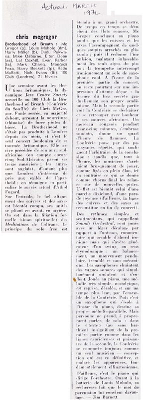 - Photocopied article from the magazine Actual about a concert by CHris McGregor's Brotherhood of Breath at the 100 Club in London, UK, organised by the Jazz Centre Society, one week before the British elections.