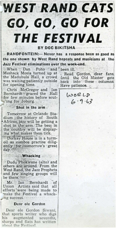 - Photocopied article from the newspaper The World. "Never has a response been as good as the one shown by West Rand hep cats and musicians at the Jazz Festival eliminations over the week-end".