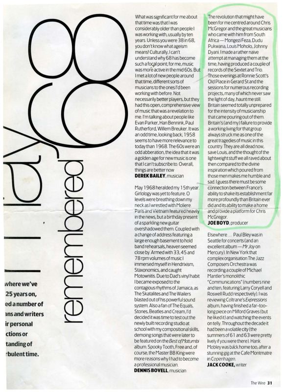 - Photocopied article from the magazine The Wire by Joe Boyd, ex-producer of Chris McGregor