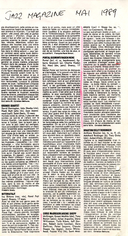 - Photocopied article from the French magazine Jazz Magazine about Chris McGregor's Brotherhood of Breath sharing the stage with Archie Shepp at a concert at La Courneuve, France, the 18th of March 1989. The author of this article criticizes the length of the concert, which was, according to him, too long (2:30 without any break).