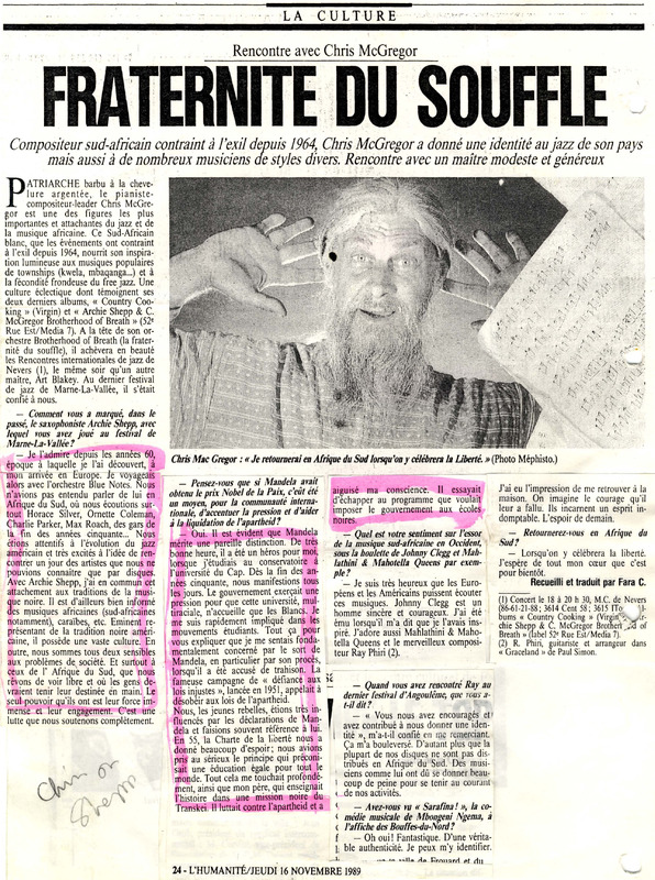 - Photocopied article from the French newspaper L'Humanité. This is an interview of Chris McGregor and his life. "South African composer exiled since 1964, Chris McGregor gave an identity to his home country's Jazz, but also to numerous musicians of various styles. Meeting with a modest and generous master."