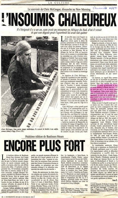 - Photocopied article about Chris McGregor one year after his death. The article is announcing a concert tribute to Chris McGregor. There is also a picture of him playing the keyboards.
