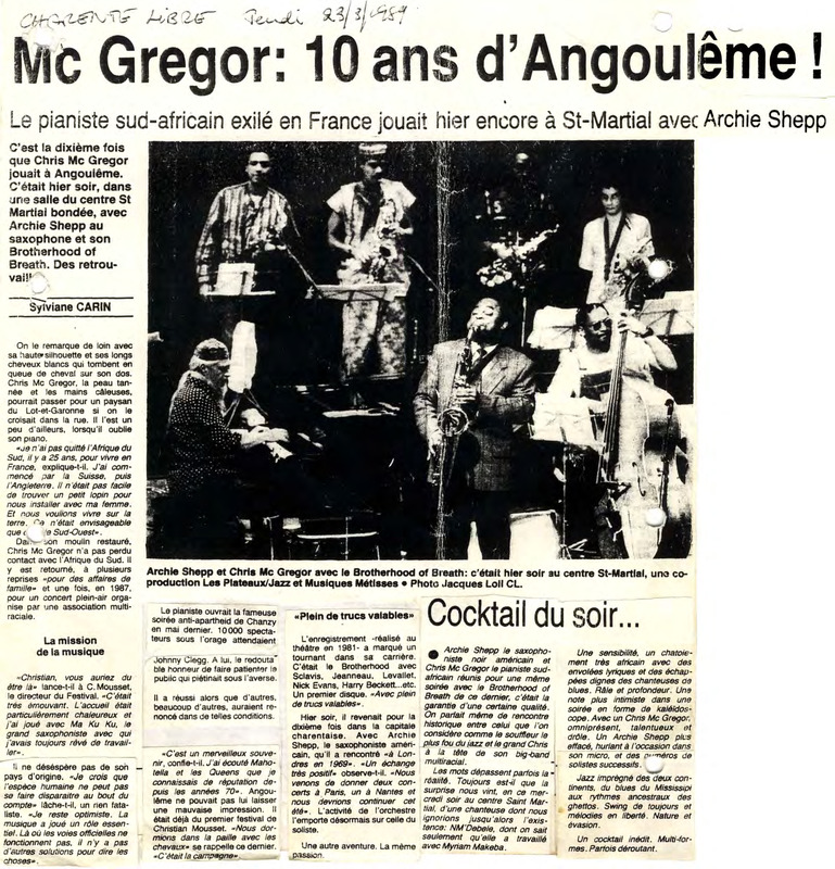 - Photocopied article from the French newspaper Charente Libre about a concert in Angoulême, France, with Chris McGregor's Brotherhood of Breath and Archie Shepp. There is a picture of Chris McGregor playing the piano (left) with the Brotherhood of Breath and Archie Shepp playing the tenor saxophone (front row - center).