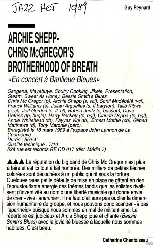 - Photocopied article from the French magazine Jazz Hot about a performance of Archie Shepp with Chris McGregor's Brotherhood of Breath at the festival Banlieues Bleues in France.
