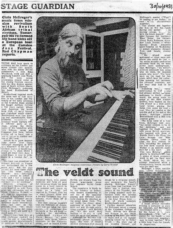 - Photocopied article from the English newspaper The Guardian about a European tour by Chris McGregor's Brotherhood of Breath. The tour starts with a concert at the Camden Jazz Festival. There is a photo of Chris McGregor playing the piano with this article.