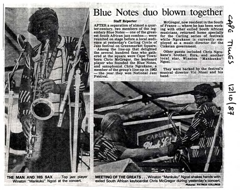 - Article from The Cape Times about Chris McGregor's concert with Winston "Mankunku" Ngozi and other guests more than 20 years after their separation at the Carling Circle of Jazz Festival in South Africa. Two photos are accompanying the article: Winston Ngozi with his Saxophone (left) and Winston Ngozi shaking hands with McGregor (right).