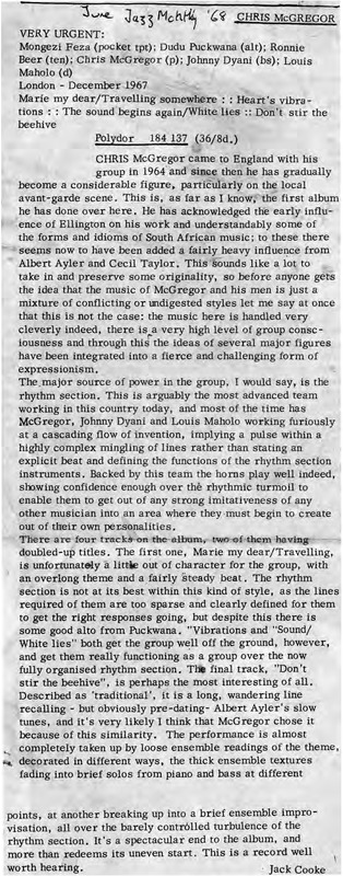 - Photocopied article from the magazine Jazz Monthly about Chris McGregor's Blue Notes recording "Very Urgent" (Polydor).