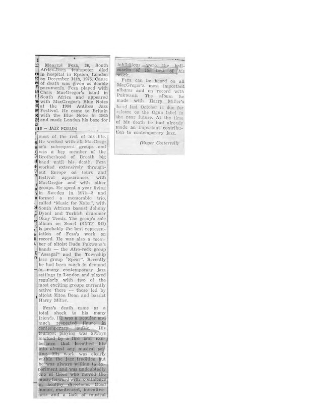 - Photocopied article from the magazine Jazz Forum about Mongezi Feza's death.