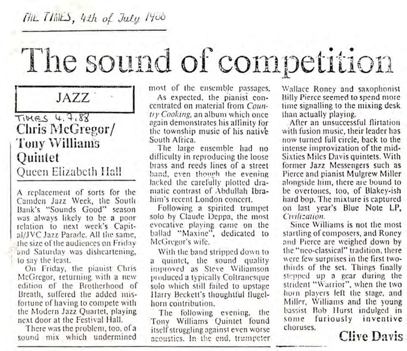- Photocopied article from The Times about 2 concerts at Queen Elizabeth Hall of Chris McGregor and Brotherhood of Breath and Tony Williams Quintet. According to the author of this article, the sound wasn't great and the musicians struggled and "seemed to spend more tome signalling to the mixing desk than actually playing".