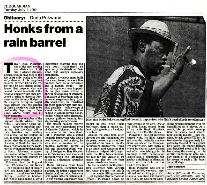 - Photocopied obituary of Dudu Pukwana from the newspaper The Guardian. A picture of Dudu Pukwana is also accompanying this article.