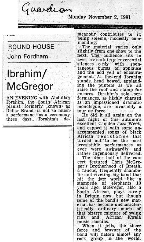 - Photocopied article from the English newspaper The Guardian about a concert by Chris McGregor and Abdullah Ibrahim (Dollar Brand).