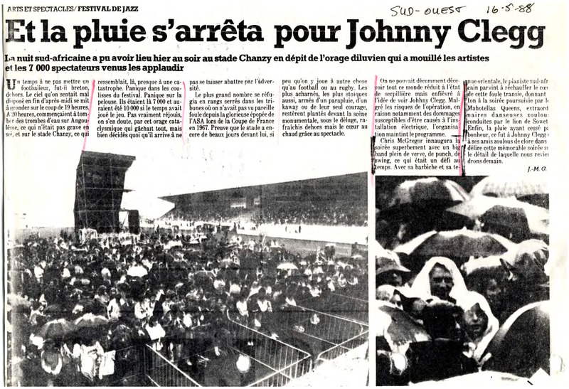 - Article form the French newspaper Sud-Ouest about a concert at the Chanzy Stadium in Angoulême, France. The organisers were waiting for 10 000 spectators to come, but because of the heavy rain and the thunderstorm, only 7000 people came braving the terrible weather. Chris McGregor opened the concert with his Big Band, followed by the Mahotellas Queens (Zulu dancers) and Johnny Clegg ended the concert. There are 2 pictures with the article, both showing the audience in the stadium in the rain.