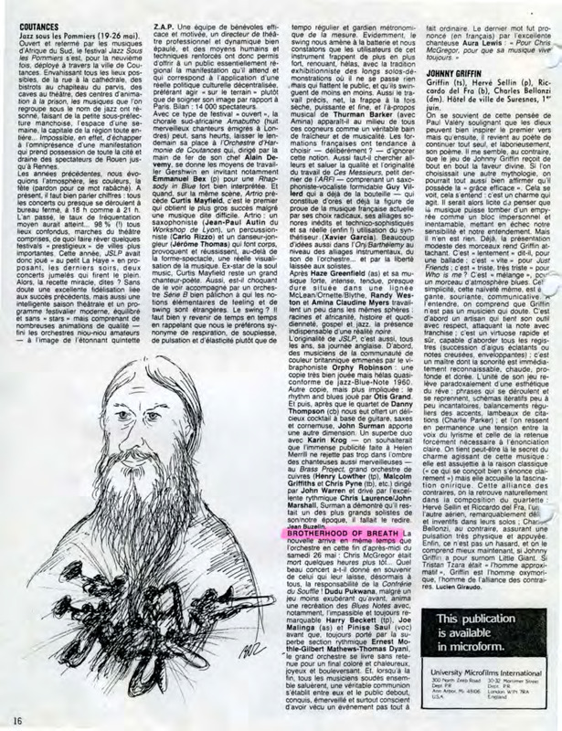 - Photocopied article in French about Chris McGregor's death. There are also 2 articles about Coutances and Johnny Griffin. A drawing of Chris McGregor is also accompanying this article.