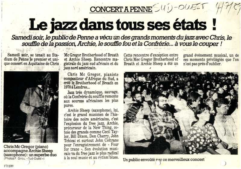 - Photocopied article from the French newspaper Sud-Ouest. "The audience of Penne, France, experienced on Saturday evening great Jazz moments with Chris McGregor, the Breath of Passion, Archie Shepp, the Crazy Breath and the Brotherhood... They were blowing away!". There are 2 pictures with this article. The left one shows Chris McGregor playing Piano accompanying Archie Shepp on the Tenor Saxophone. The right picture shows the audience at the concert.