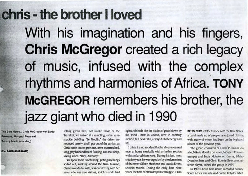 - Photocopied interview of Tony McGregor, Chris McGregor's brother from the newspaper Vrye Weekblad. "With his imagination and his fingers, Chris McGregor created a rich legacy of music, infused with the complex rhythms and harmonies of Africa. Tony McGregor remembers his brother, the jazz giant who died in 1990.". A picture of the Blue Notes with (from left to right) Dudu Pukwana, Sammy Maritz, Chris McGregor and Mongezi Feza.