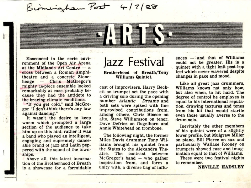 - Photocopied article from the British newspaper Birmingham Post about a Jazz Festival with Chris McGregor's Brotherhood of Breath and Tony Williams Quintet in the Open Air Arena at the Midlands Art Centre.